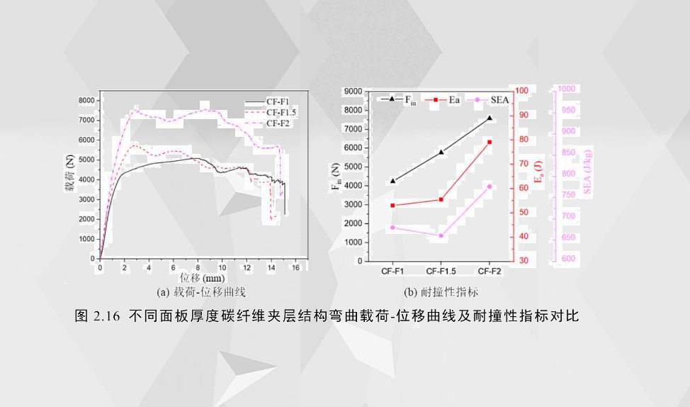 圖2.16(a)比較了不同面板厚度碳纖維夾層結(jié)構(gòu)的載荷-位移曲線,可以發(fā)現(xiàn),CF-F1的載荷-位移曲線屬于曲線類型Ⅲ,而其臨界失效模式為壓痕壓入(IN);由于碳纖維在拉伸過程沒有明顯的塑性變形,當(dāng)其開始失效時(shí),后續(xù)載荷的變化趨勢與臨界載荷為IN的鋁合金夾層結(jié)構(gòu)有一定的差異,CF-F1開始失效時(shí),載荷并沒有下降,只是增加的幅度大大地減少。CF-F1.5和CF-F2的臨界失效模式為芯層剪切失效(CS),二者達(dá)到臨界載荷之后載荷有所降低,兩者的載荷-位移曲線屬于類型IV。與CF-F2不同的是,CF-F1和CF-F1.5其后期壓潰力的大小變化趨勢相對(duì)平緩。試件整體斷裂前(14-16mm處)的變形模式主要存在芯層泡沫壓縮、剪切裂紋和界面失效,隨著位移的增加,面板纖維發(fā)生斷裂,試件失去承載能力。