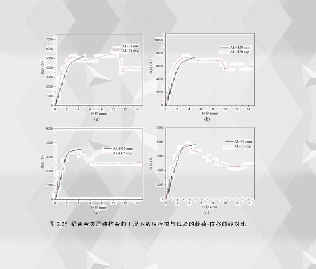圖2.25展示了四種試件在彎曲位移0至5mm的數(shù)值模擬載荷-位移曲線及其相應(yīng)的實驗曲線,其中(a)和(b)的臨界失效模式為壓痕壓入(IN),(c)和(d)為芯層剪切(CS),圖中曲線均為原始數(shù)據(jù),未作濾波處理。