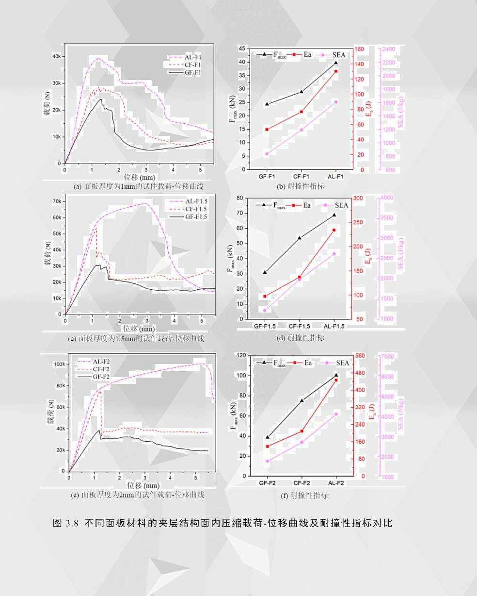 通過比較面板厚度相同但材料不同的夾層結構載荷-位移曲線,如圖3.8所示,可發現鋁合金夾層結構的曲線高度明顯高于同等面板厚度下的纖維增強夾層結構。由于鋁合金面板的彈性模量比纖維增強復合材料的大,所以夾層結構在第一階段(彈性階段)的斜率最大,即剛度最大。從基材力學測試的數據可以看出,鋁合金面板的極限強度比纖維增強復合材料面板的強度要低,但通過耐撞性指標可以看出,鋁合金夾層結構具有最大的峰值力,造成這種現象的主要原因是由于面板為脆性材料的纖維增強夾層結構的上、下面板之間尺寸誤差或裝配誤差的疊加效應對載荷的損失比面板為彈塑性材料的鋁合金夾層結構的要大得多,而這種疊加效應對彈塑性材料的極限承載能力影響非常小,從而解釋了鋁合金夾層結構比纖維夾層結構具有更大的極限載荷。此外,在纖維增強夾層結構的失效過程可以看出,纖維增強夾層結構面板的脆性斷裂通常首先僅發生在某一面板,而不是兩面板同時脆性斷裂,這也解釋了面板疊加效應的存在。通過不同面板材料的夾層結構面內壓縮的耐撞性指標比較可以看出,在具有相同尺寸配置的前提下,鋁合金夾層結構有最好的耐撞性能,而玻璃纖維夾層結構有最差的耐撞性能。
