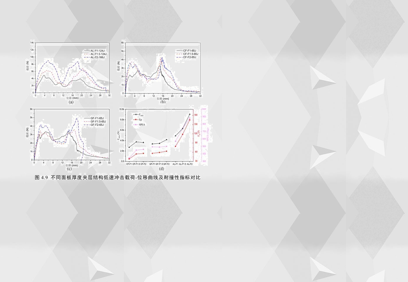為了研究夾層結(jié)構(gòu)的面板厚度對(duì)沖擊性能的影響,圖4.9(a)-(c)比較了三種不同面板厚度的夾層結(jié)構(gòu)的載荷-位移曲線。無論是彈塑性面板還是脆性面板,夾層結(jié)構(gòu)的面板厚度對(duì)其低速?zèng)_擊響應(yīng)均有較大影響。為了更直觀地比較,圖4.9(d)對(duì)比了不同面板厚度夾層結(jié)構(gòu)的耐撞性指標(biāo),通過觀察,鋁合金夾層結(jié)構(gòu)的耐撞性能隨面板厚度增加而明顯增加,面板厚度從1mm增加到2mm,其初始峰值載荷、穿透吸能和比穿透吸能分別提高了84%108%54%;對(duì)玻璃纖維夾層結(jié)構(gòu)而言,當(dāng)面板厚度從1mm增加到2mm,其初始峰值載荷和穿透吸能分別只提高了24%13%,而面板厚度的增加對(duì)比穿透吸能的影響效果差異不大;而對(duì)碳纖維夾層結(jié)構(gòu)而言,當(dāng)面板厚度從1mm增加到2mm,其穿透吸能和比穿透能分別提高了42%33%,并且隨著層數(shù)的增加,耐撞性指標(biāo)增加的幅度大幅減小。